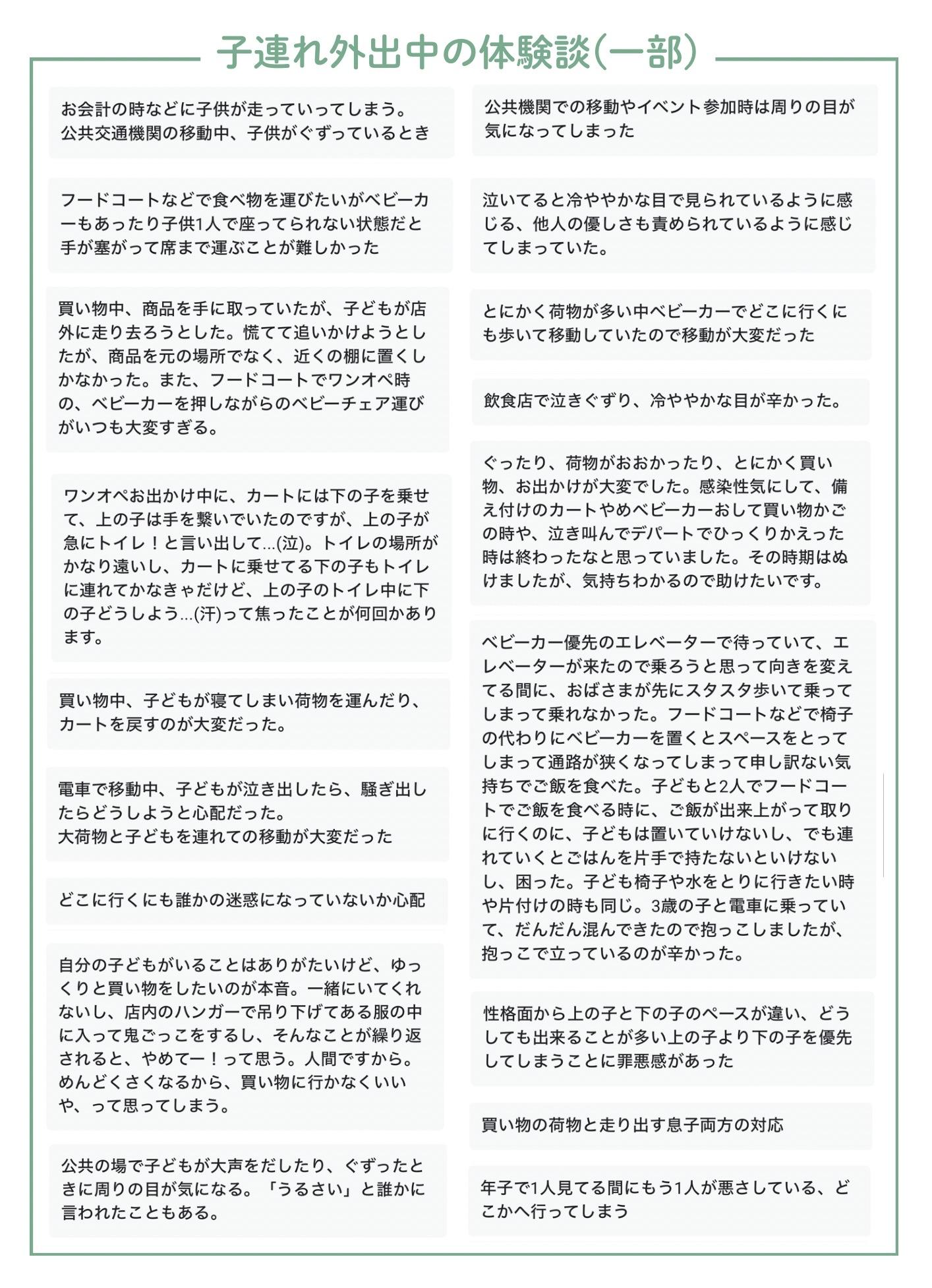 「子どもを連れていることで誰かに迷惑をかけるのではないかという不安」など、