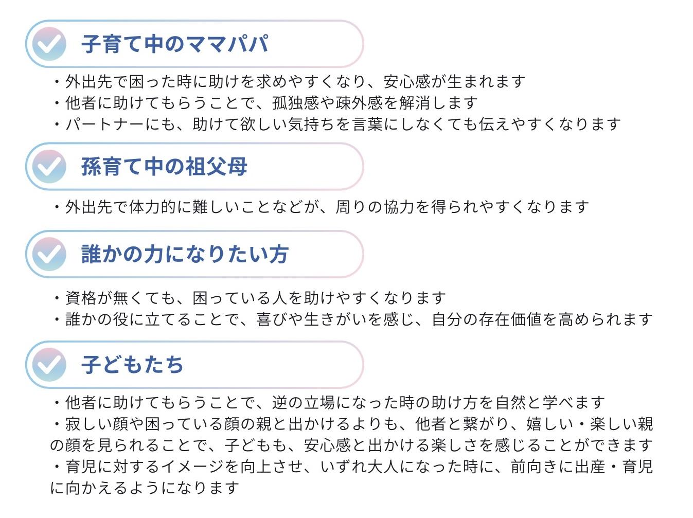 例えば、お出かけや旅行先、引越し先、上の子を連れて里帰りした先でも。どこに行っても共通の認識が必要です。それは、助けて欲しい側の人にとっても、助ける側の人にとっても、社会にとっても、大きな意味があります。