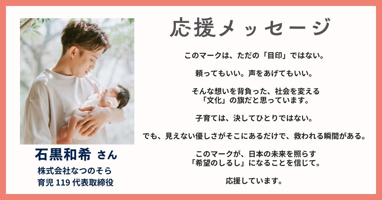 子育てマークは、誰かを特別にするマークではなく、「おたがいさま」「助け合い」の気持ちを形にしたマークです。このマークをきっかけに、優しく温かな繋がりが社会に広がっていくことを願っています。